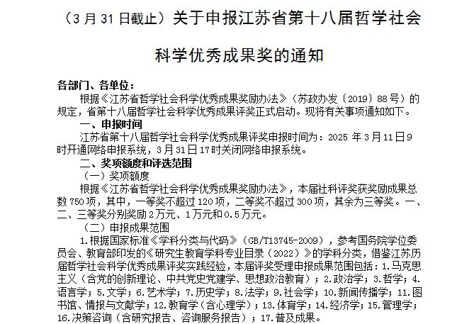 关于申报江苏省第十八届哲学社会科学优秀成果奖
